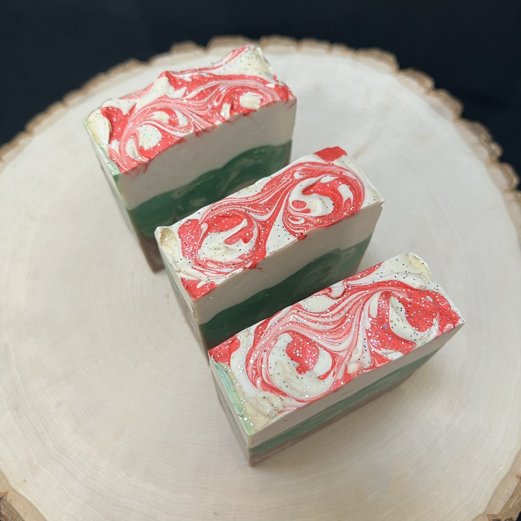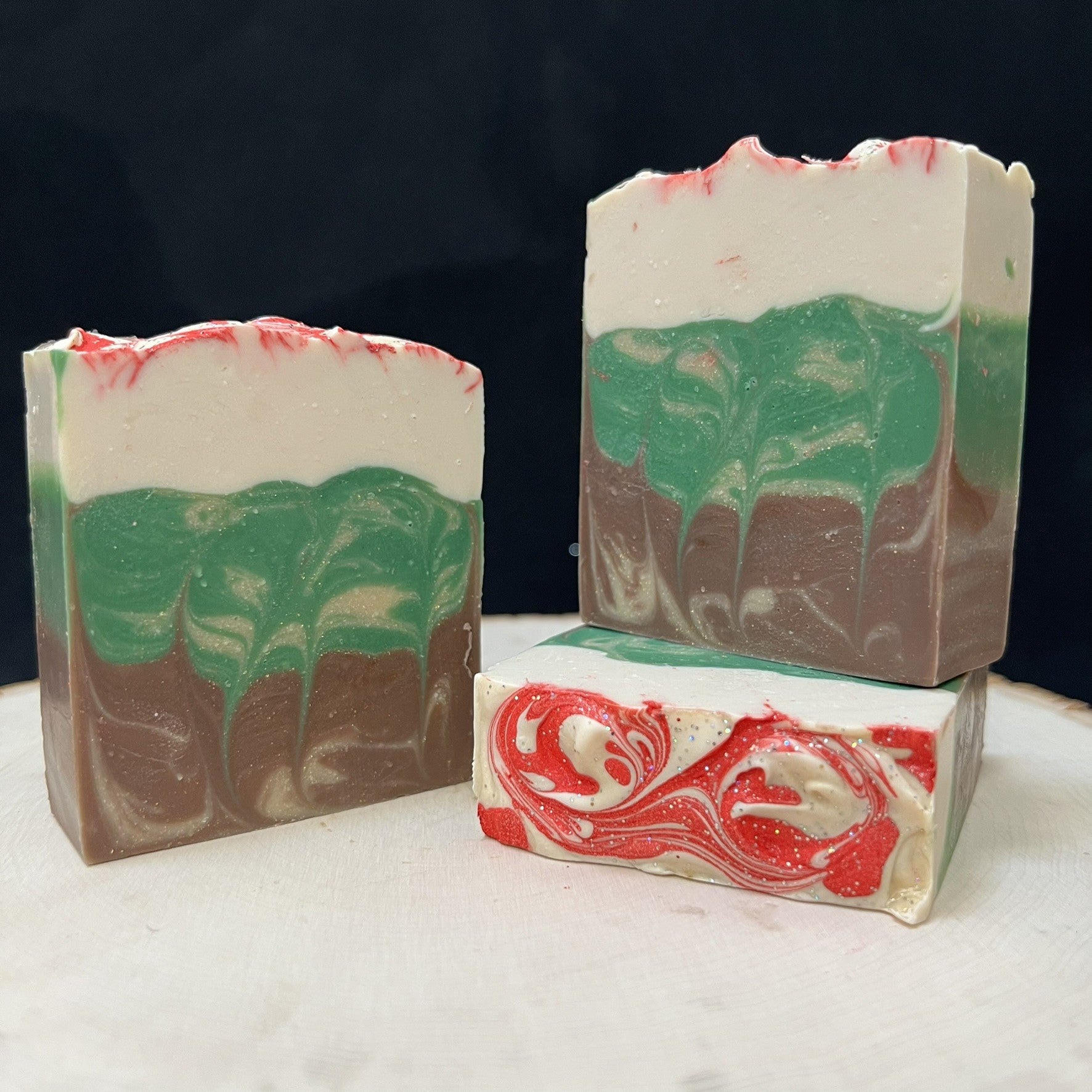 Forged from a nourishing blend of olive, coconut, shea butter, sweet almond, and castor oils, this bar delivers a rich, skin-loving lather. Mica and titanium dioxide swirl like frost across its surface, while sodium lactate ensures it stands firm against the cold.